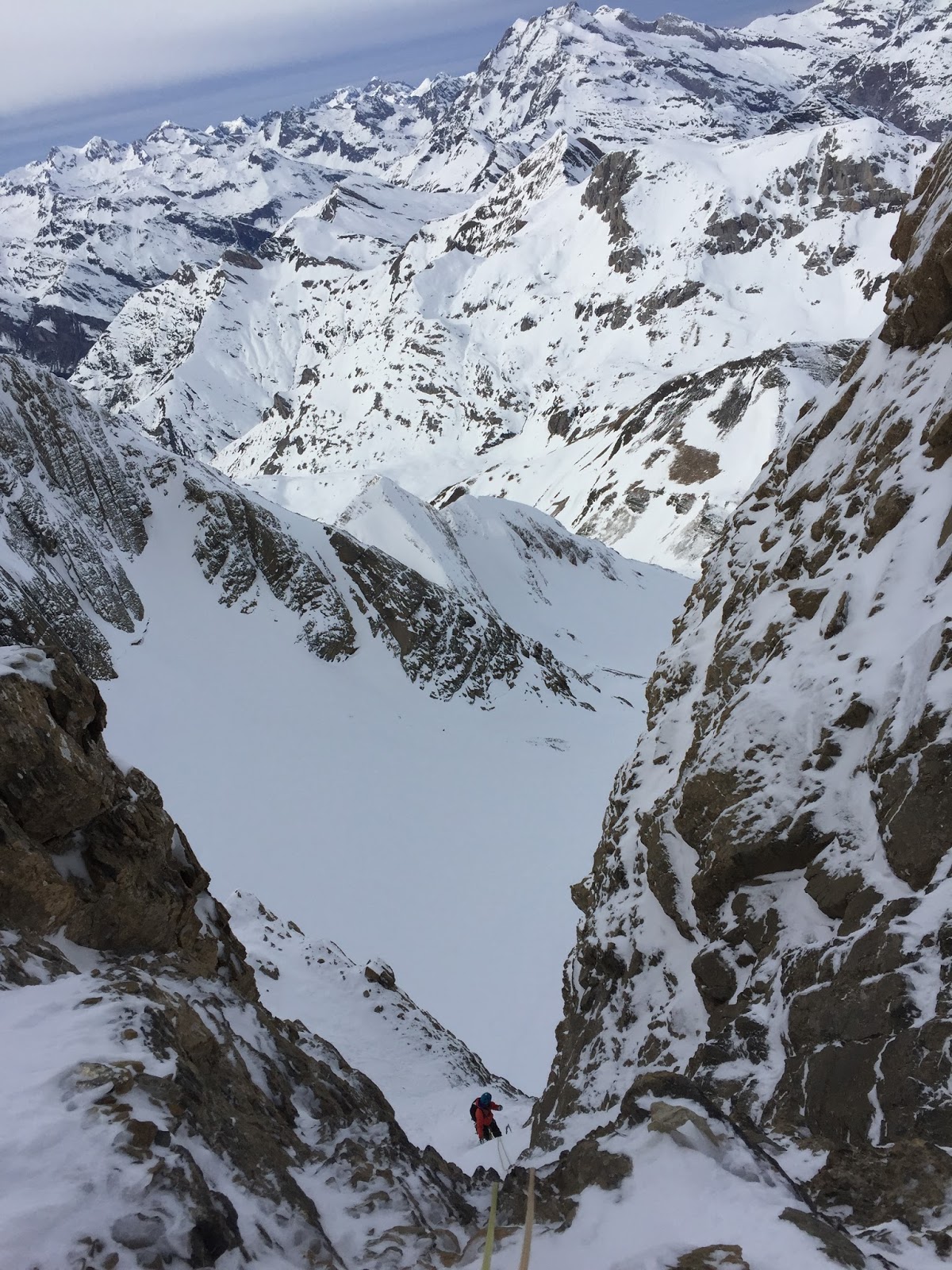 Bien loin de nous décourager, on se regarde toutes les deux et on se dit, on va à la goulotte Centrale? Il n'y a que deux cordées, c'est la plus difficile des trois de la face... "Mais bien sûr qu'on y va !!" Et voilà! On se lance dans l'aventure! On n'avait pas pris de renseignements sur la goulotte mais on y va comme même !